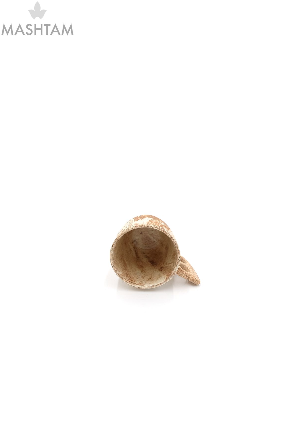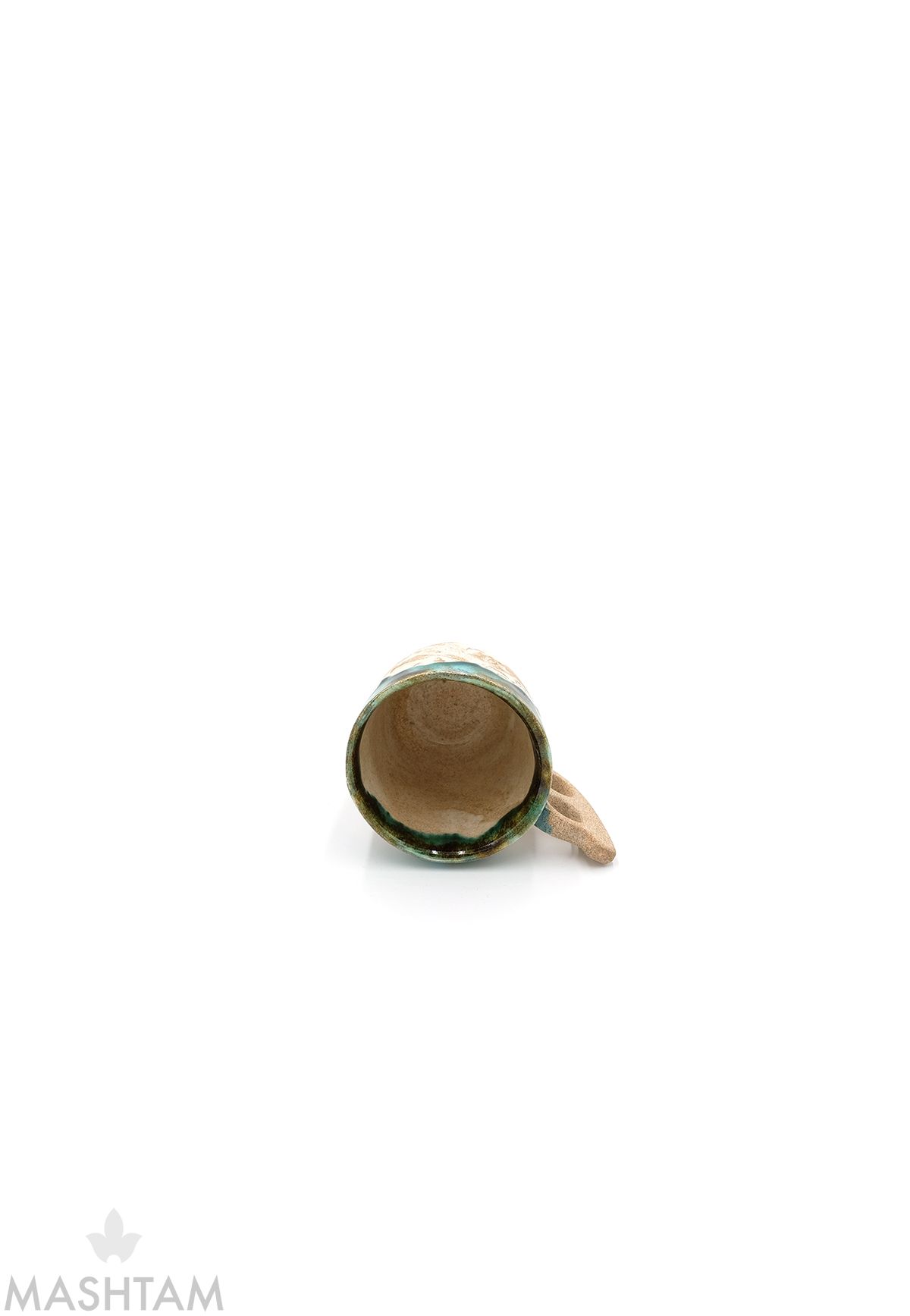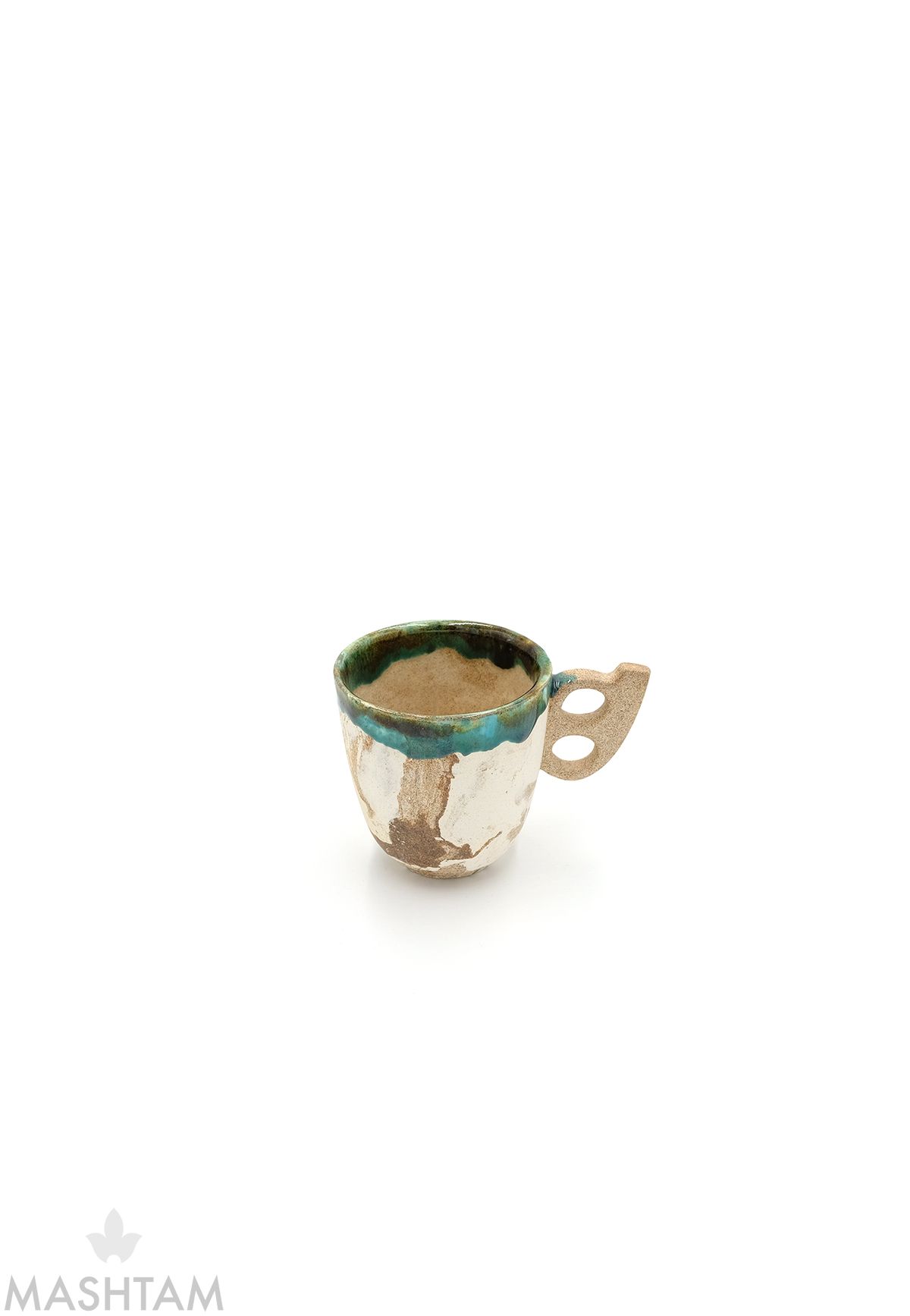 Handgetöpferte Tasse aus Keramik, mit außergewöhnlich grüner Glasur. Dieser Tasse hat der Buchstabe (H) in Farsi-Sprache als Halterung.