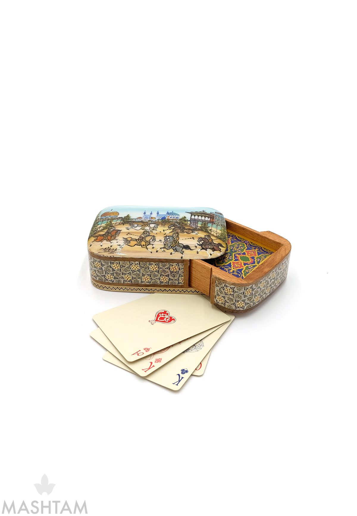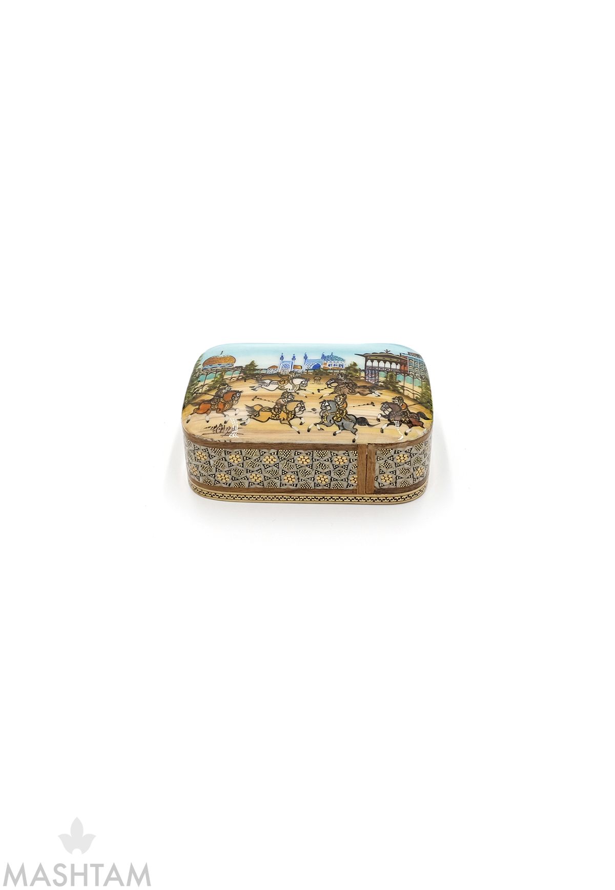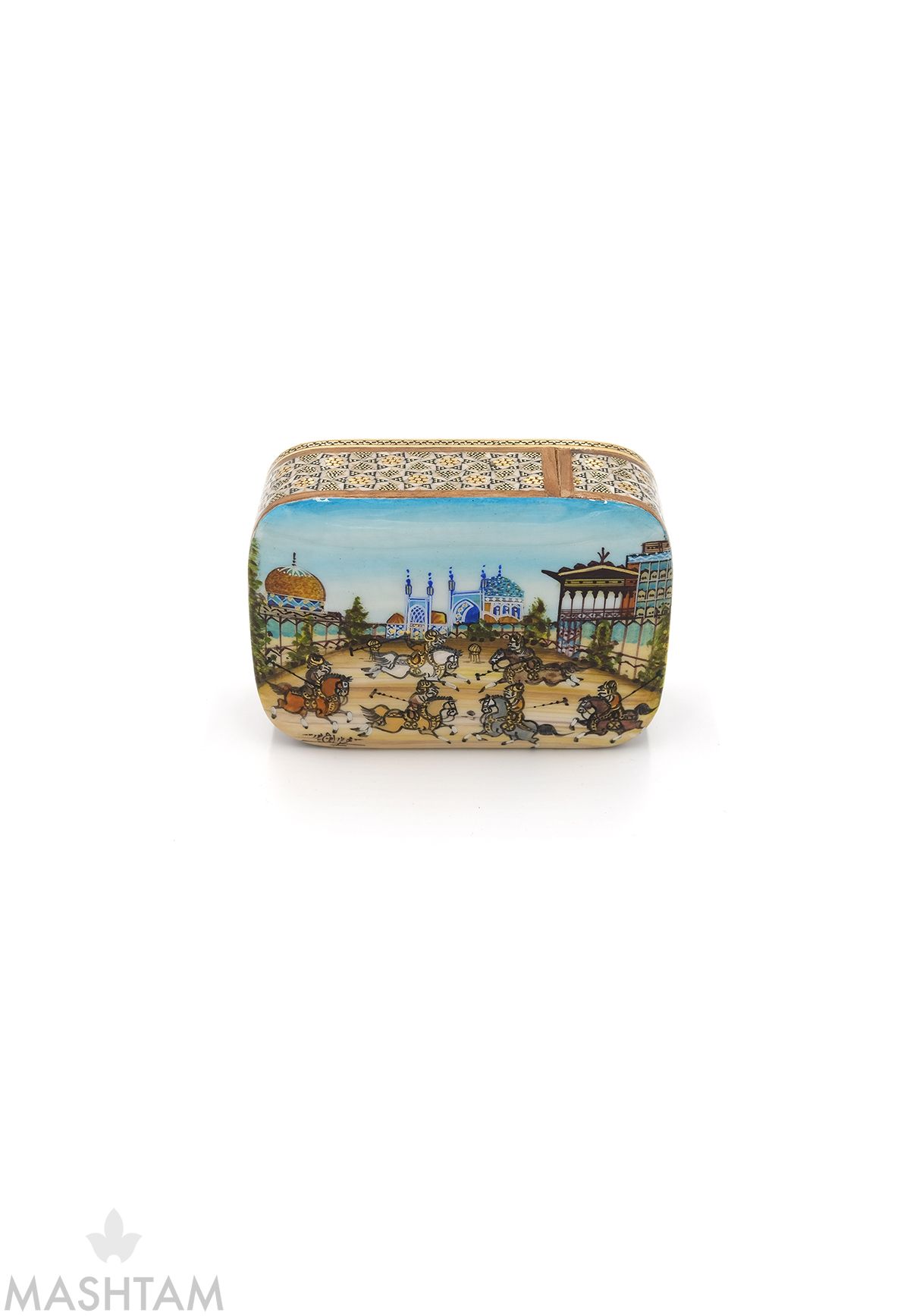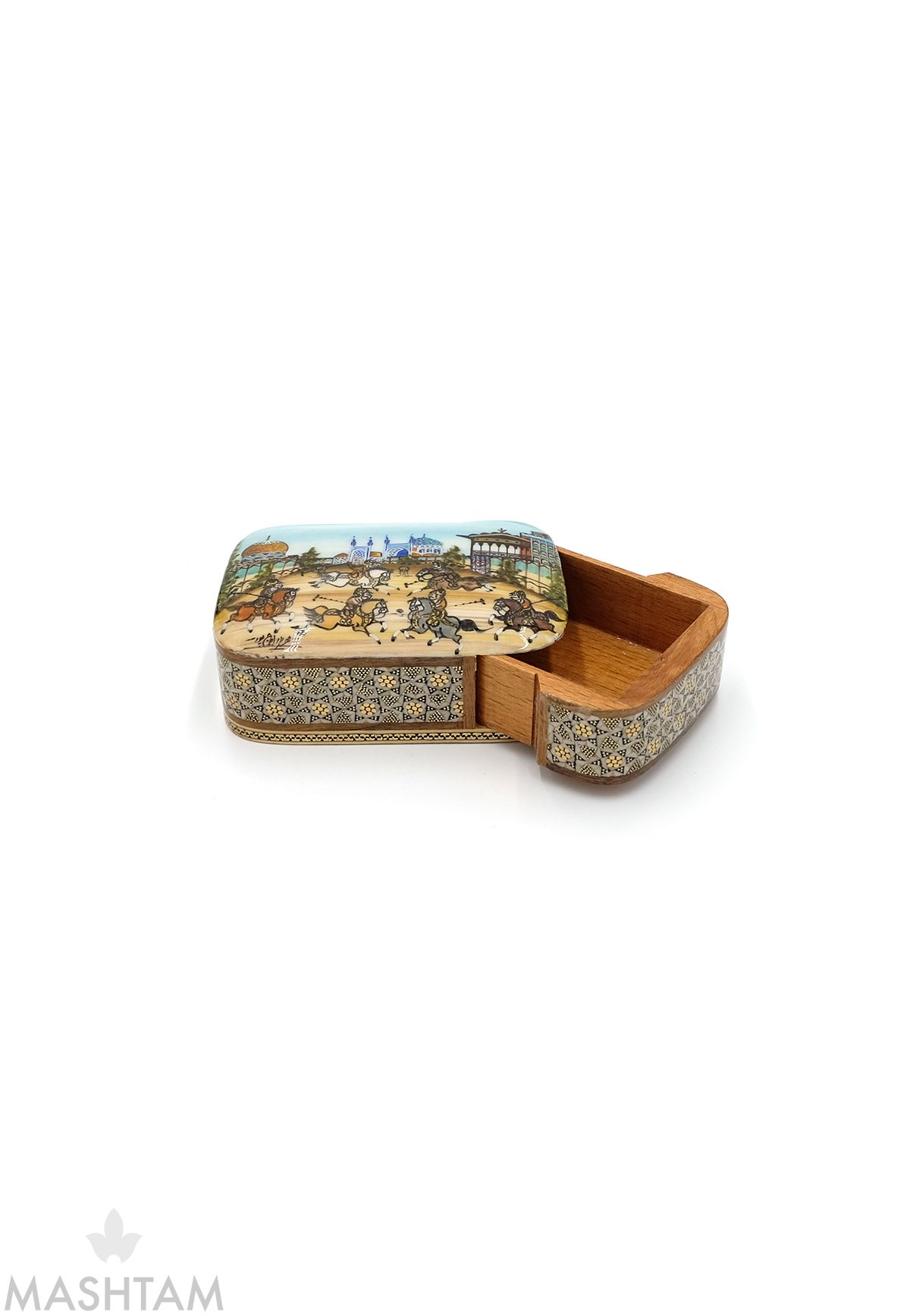Khatam" auch "Khatam Kari" ist eine alte Eilegetechnik aus Holz, Muscheln, Knochen und Draht der Persian stammt. Das Design der Intarsien ist sehr aufwendig. Khatam Kari besteht aus der Herstellung von Muschelmustern mit dünnen Holzstöcken (Ebenholz, Teak, Ziziphus, Orange, Rose), Messing (für die Goldteile), Kamelknochen (weiße Stücke). In jedem Kubikzentimeter Raum werden bis zu etwa 250 Metall-, Knochen-, Elfenbein- und Holzstücke nebeneinandergelegt. Khatamkari blühte während der Safawiden-Zeit auf.
