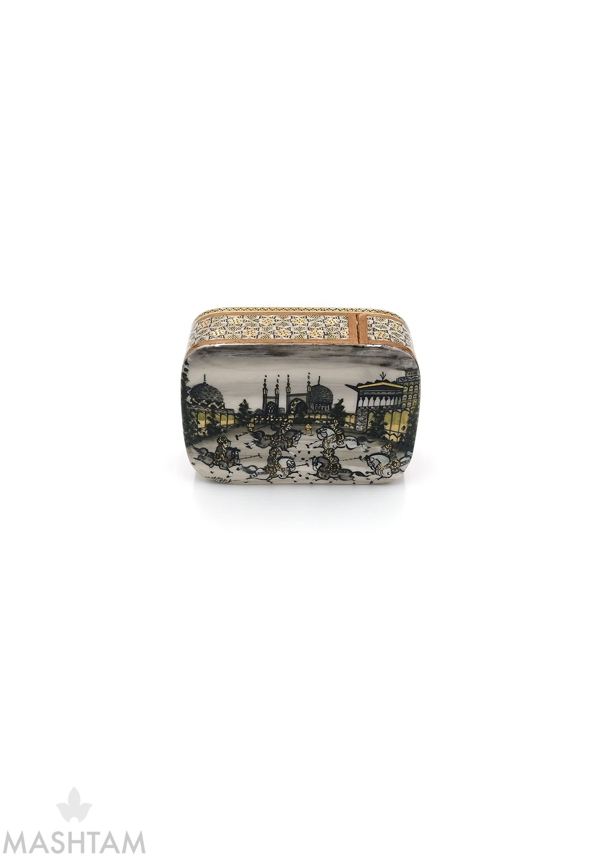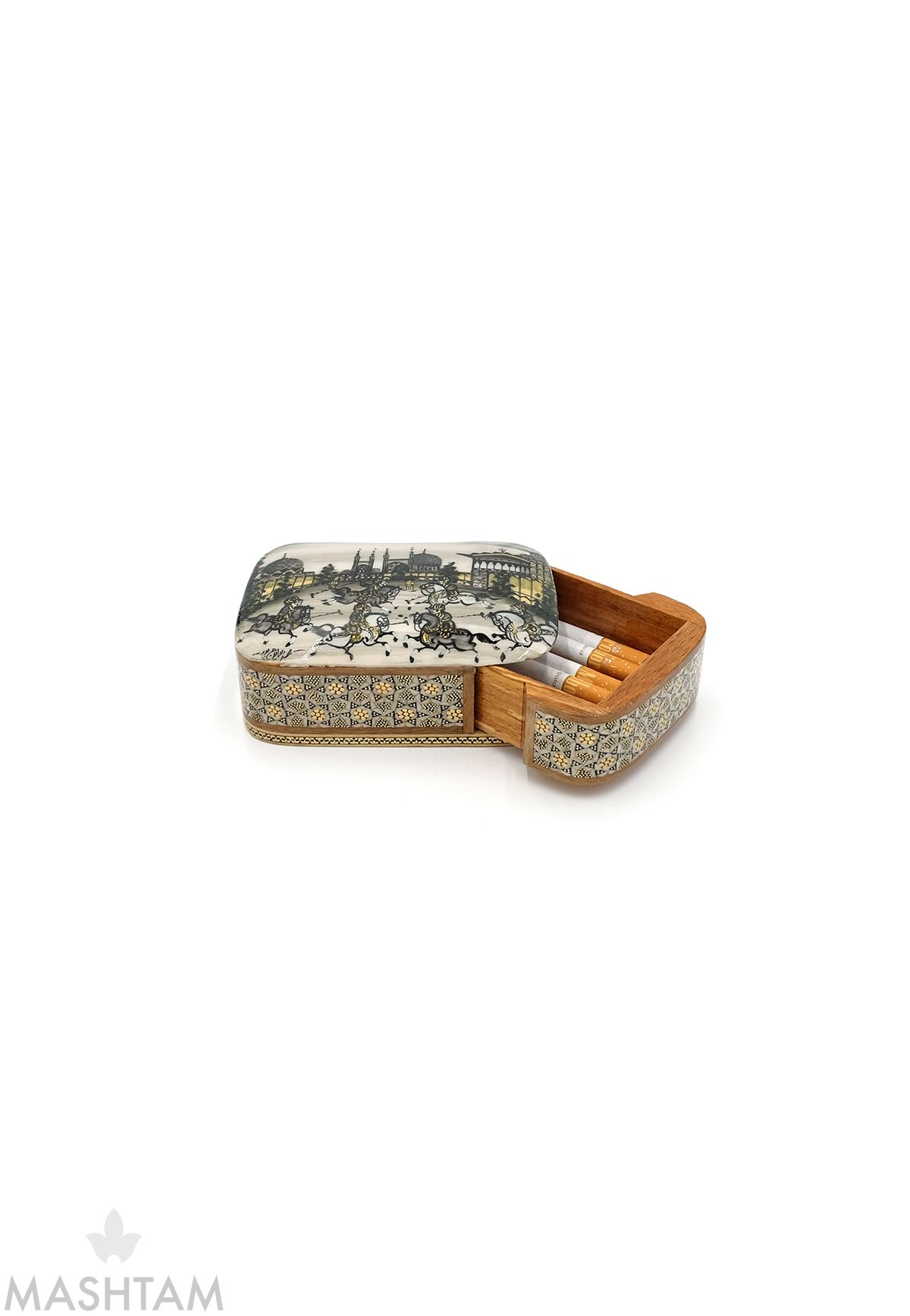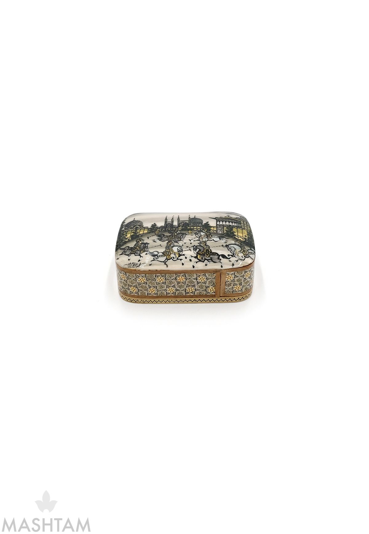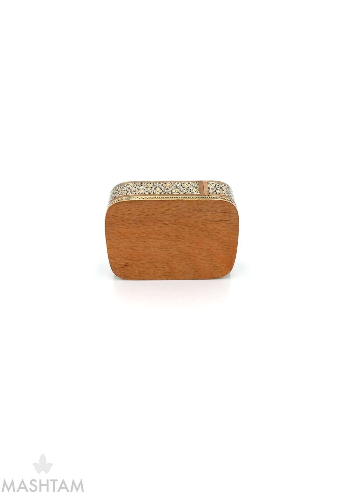 Khatam" auch "Khatam Kari" ist eine alte Eilegetechnik aus Holz, Muscheln, Knochen und Draht der Persian stammt. Das Design der Intarsien ist sehr aufwendig. Khatam Kari besteht aus der Herstellung von Muschelmustern mit dünnen Holzstöcken (Ebenholz, Teak, Ziziphus, Orange, Rose), Messing (für die Goldteile), Kamelknochen (weiße Stücke). In jedem Kubikzentimeter Raum werden bis zu etwa 250 Metall-, Knochen-, Elfenbein- und Holzstücke nebeneinandergelegt. Khatamkari blühte während der Safawiden-Zeit auf.