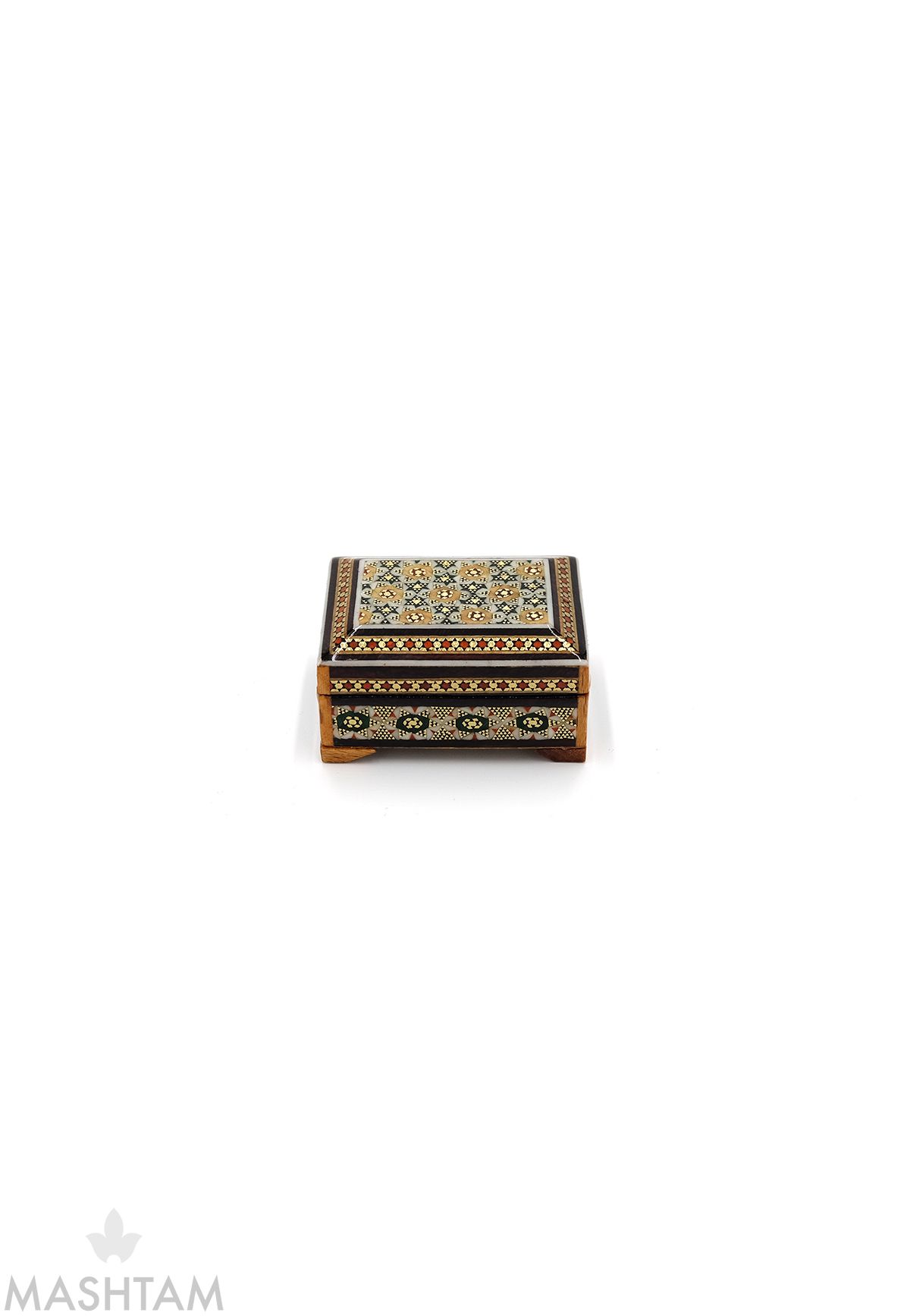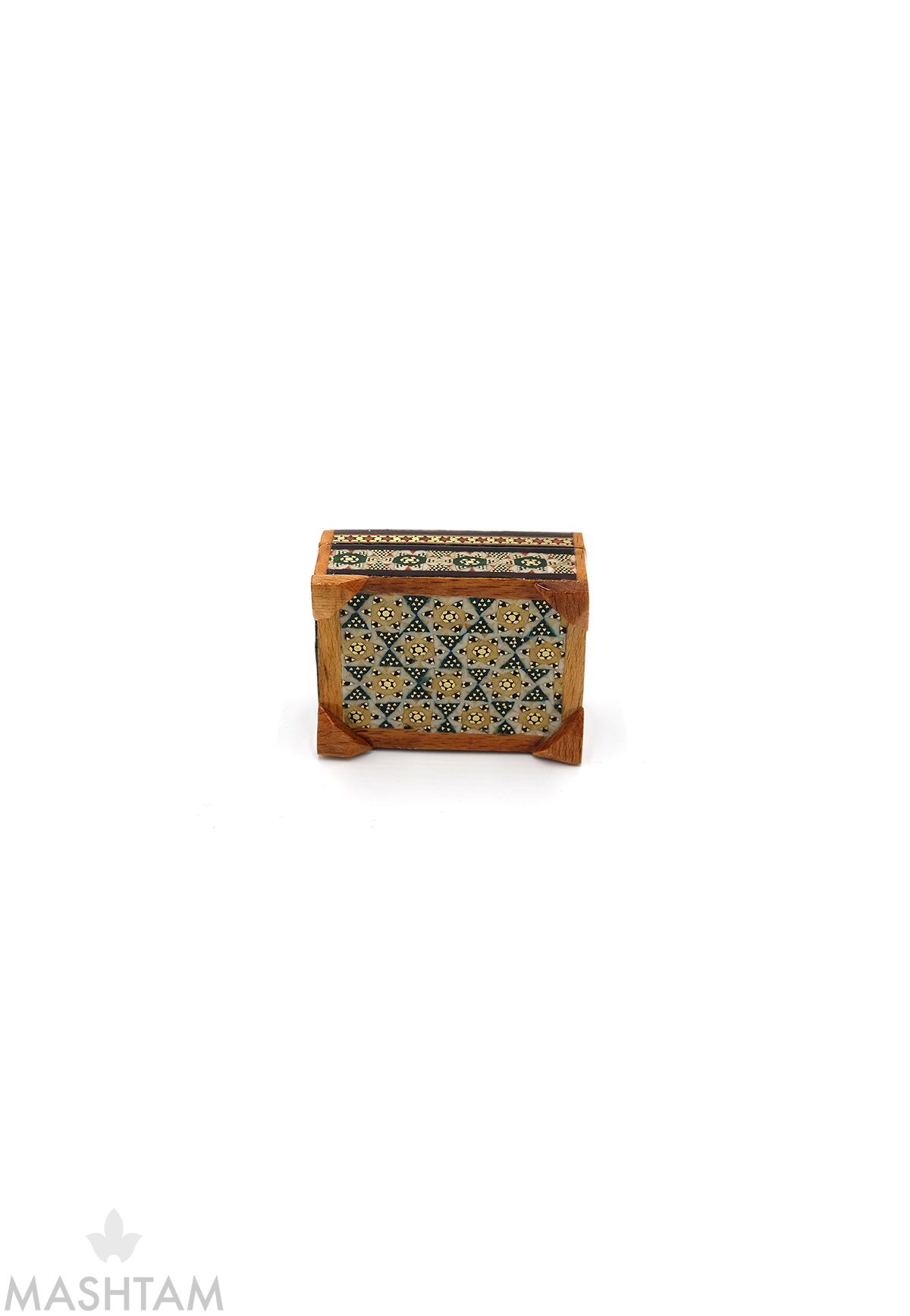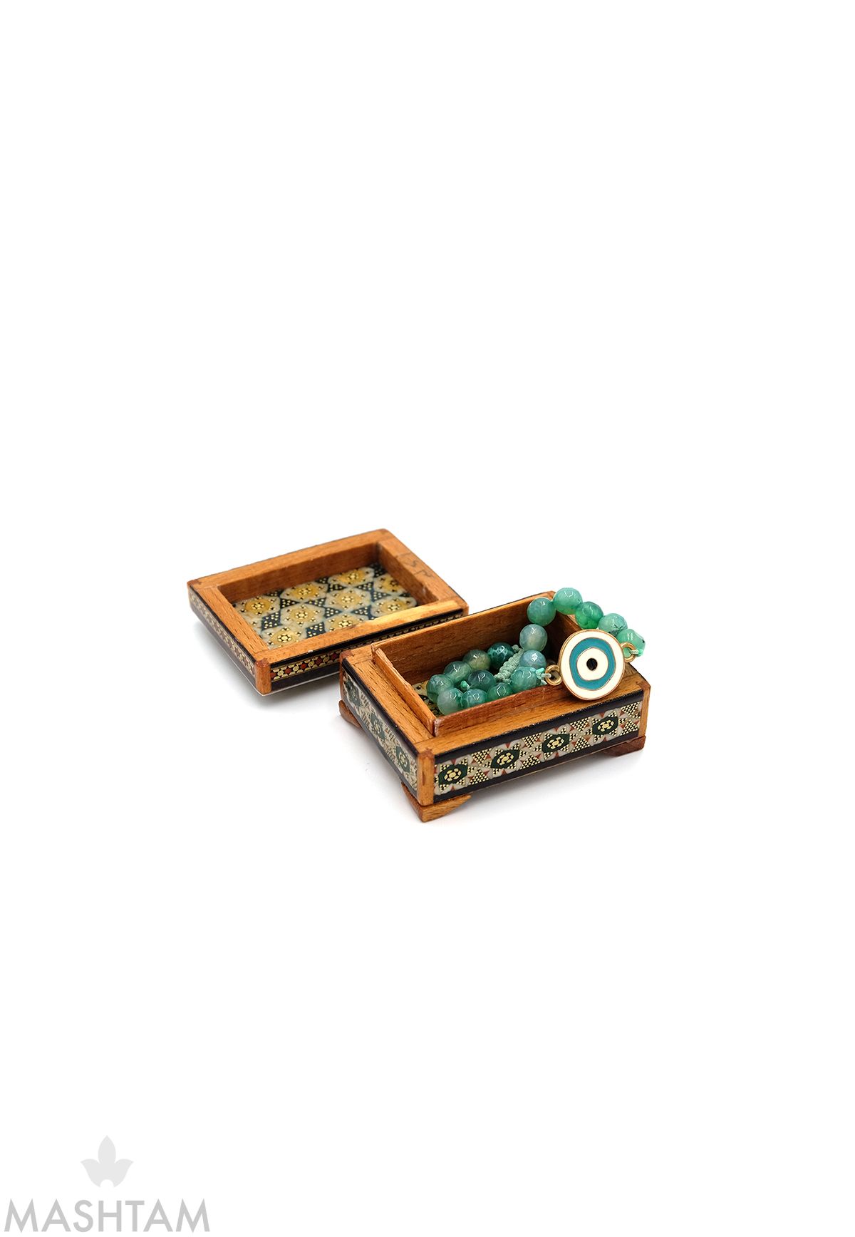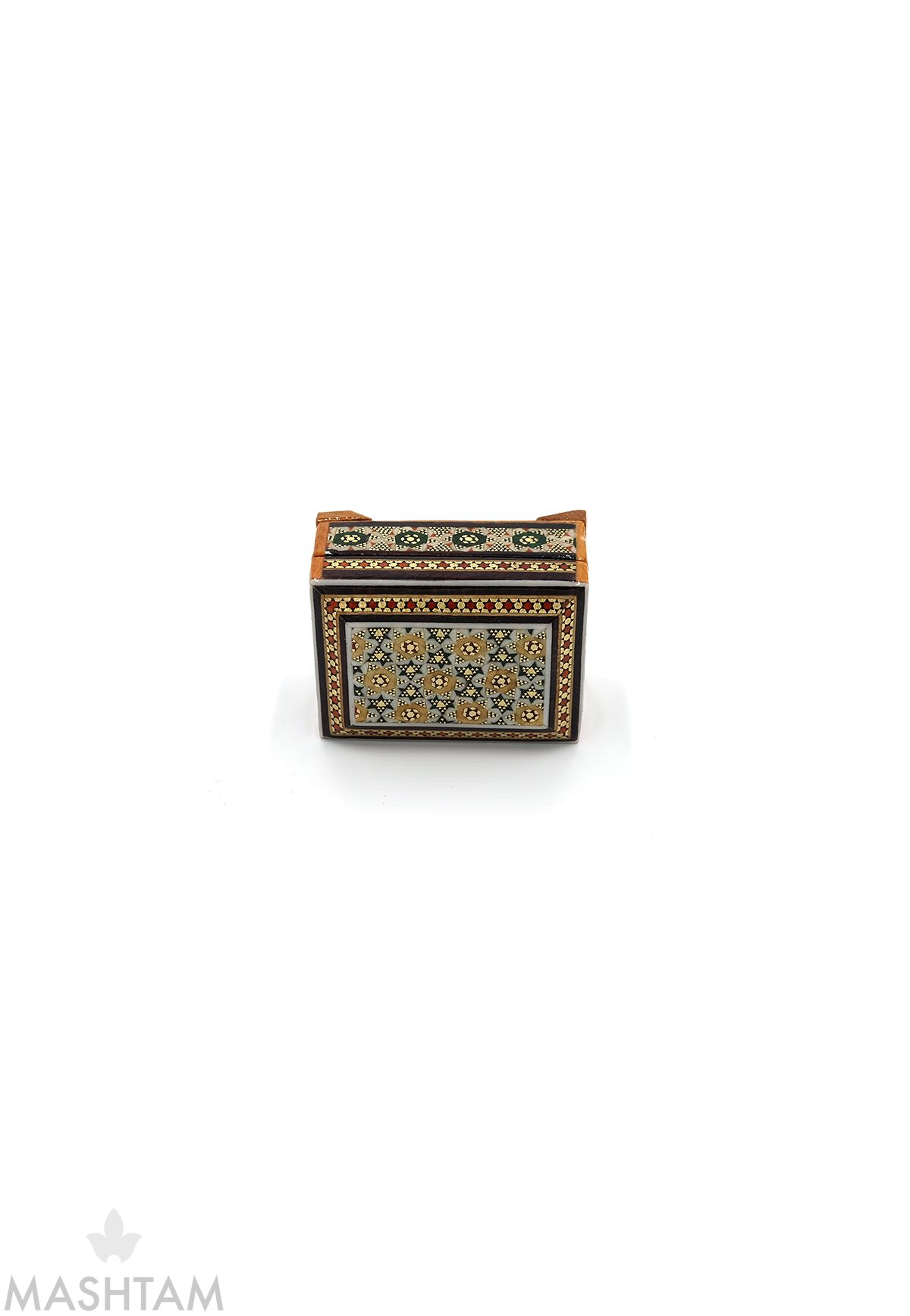 Khatam" auch "Khatam Kari" ist eine alte Eilegetechnik aus Holz, Muscheln, Knochen und Draht der Persian stammt. Das Design der Intarsien ist sehr aufwendig. Khatam Kari besteht aus der Herstellung von Muschelmustern mit dünnen Holzstöcken (Ebenholz, Teak, Ziziphus, Orange, Rose), Messing (für die Goldteile), Kamelknochen (weiße Stücke).